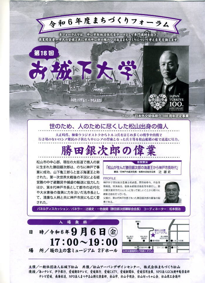 ○大正5年(1916) ○故郷松山市の済美女学會(現在の済美高等学校)校舎「勝田館」として屋内体操場と教室6室を寄贈 当時の金額で1万6千6百4十円也