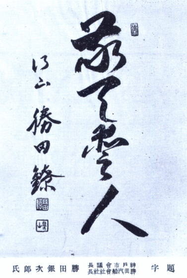 昭和10年楠木正成公600年大祭が開催され今に残る湊川公園の「大楠公騎馬像」台座の「大楠像」は勝田の揮毫である。