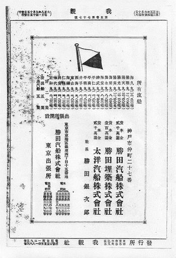 勝田商会は大正元年御代丸を購入、4年海福丸、永代丸、井出丸、興安丸の4隻を買取、海永丸、海祥丸など3隻を建造、11年には10隻6万7千トン、最盛時には20隻15万トンの商船隊所有。