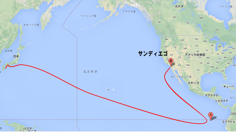 そして、二週間後、大海原の向こうに陸地がぼんやり見えてきました。「今度こそアメリカ大陸に違いない」こうして住吉丸は目的地シアトルから2000キロ南のサンディエゴの海岸にようやくたどり着きました。日本を発って実に76日目。明治45年の今日、7月18日のことでした。