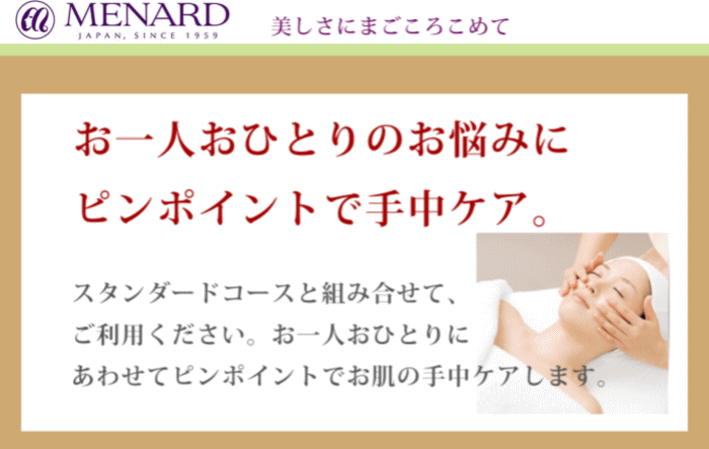 ていねいなカウンセリングをもとに、お一人おひとりのために選んだメーカーならではの粧材や機器を使い、繊細なハンドテクニックによって奏でていく至福のリラクゼーション。メナードの総合研究所による先進の研究や東洋・西洋の伝承技法をゆたかに融合させたエステティックメソッドは、肌へ、こころへ働きかけ、内面から輝くような真の美しさへみちびきます。