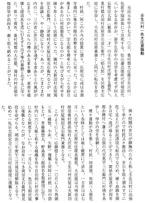 壬生川村では、元治元年に桑村郡大庄屋で壬生川村庄屋一色新平が病死した後、彼の子宗太郎が継ぎましたが幼年の為罷免され桑村郡古田村庄屋芥川彦左衛門が壬生川村庄屋に任命されました。