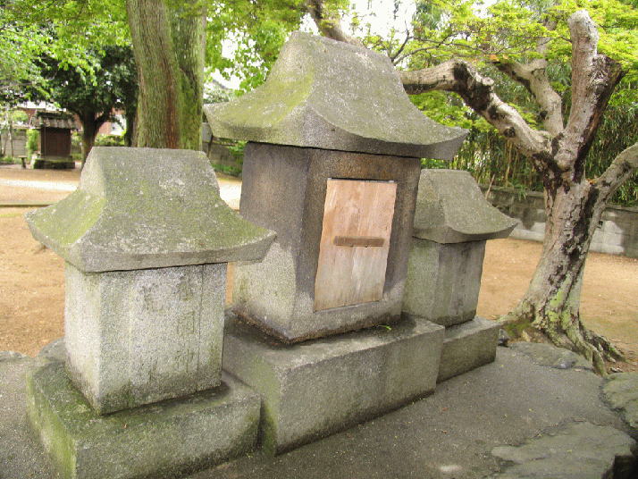 方形の石積みの上に、中央が牛頭天皇、向かって左側に荒神・祇園神社があり、右側に但馬の守が祀られ、少し放れて自然石の社日宮がある。