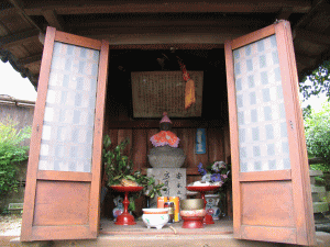 また、同じ敷地の入口に安永5年(1776)7月24日、と刻字のある地蔵さんが西向きに祀られ、その裏側に数子の石(加工されたものもある)を墓状に積み重ねたもの等が散在している。