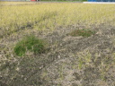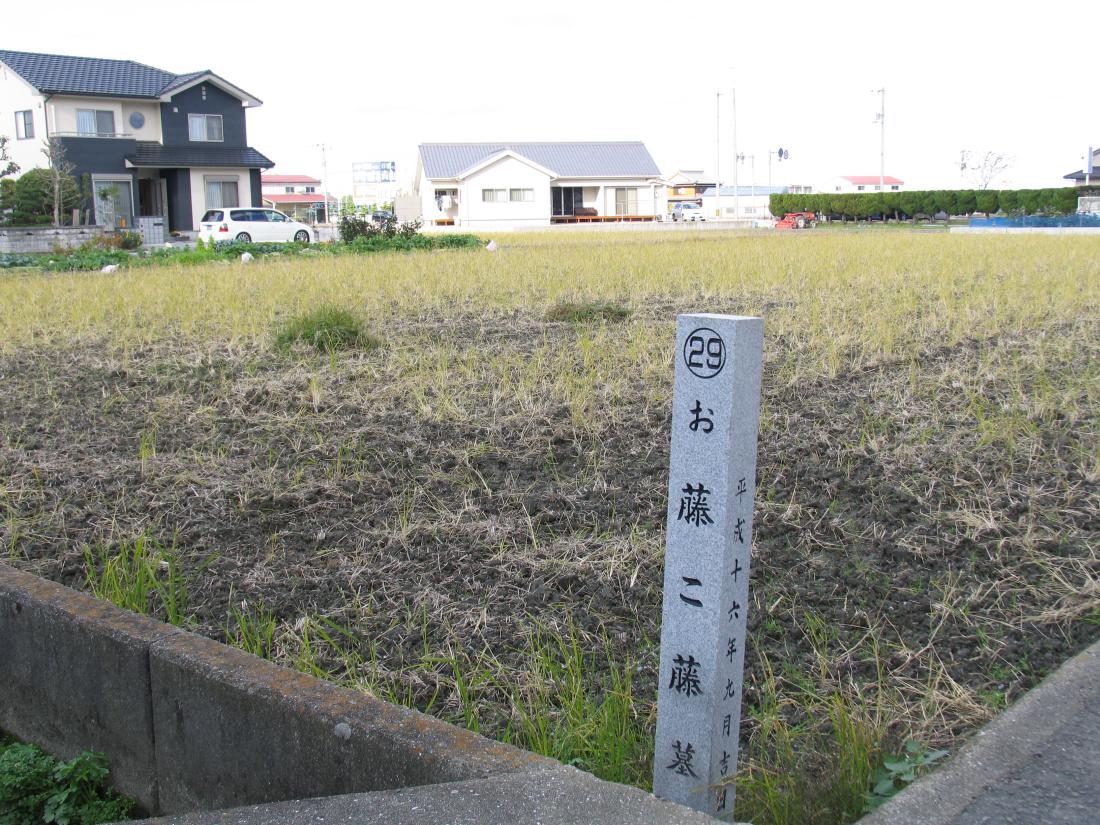 | ○藤四郎の妻の墓は天神の密乗院の東の田の中にあり樹木の茂った所であったが現在は田の隅に墓が一基たっています。 |