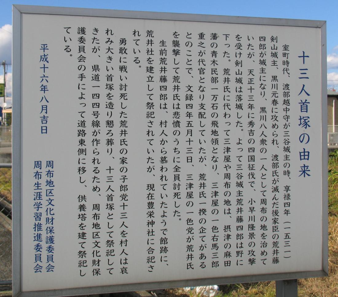 昭和63年首塚の所に県道が通ることになり、周布文化財保護委員会によって霊を供養し還座祭りを行い、道の東側に移転、伝承の十三人首塚の供養塔を建て祀っています。